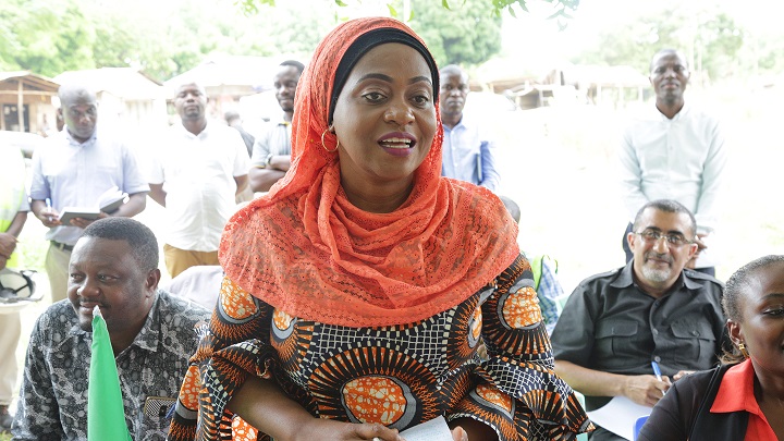 Naibu Waziri wa Nishati, Subira Mgalu akiongea na wananchi wa Ngobanya kata ya Kimbiji,Wilaya ya Kigamboni, Mkoa wa Dar es Salaam wakati wa ziara ya ukaguzi wa kazi ya kusambazaji umeme Mkoani humo.