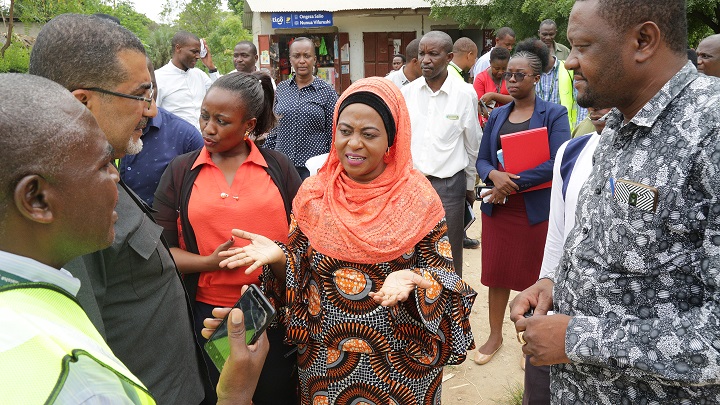 Naibu Waziri wa Nishati, Subira Mgalu akiongea na watalaam mbambali wa Shirika la Umeme Tanzania mara baada ya kufanya ukaguzi wa kazi ya kusambazaji umeme katika mtaa wa Ngobanya kata ya Kimbiji,Wilaya ya Kigamboni, Mkoa wa Dar es Salaam.