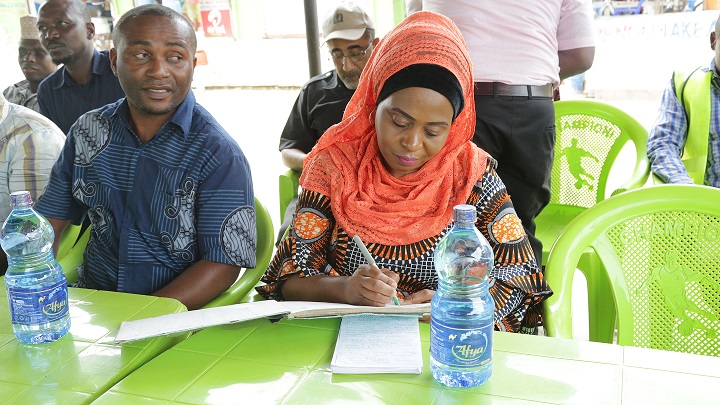 Naibu Waziri wa Nishati, Subira Mgalu akisaini kitabu cha wageni mara baada ya kufika katika mkutano wa hadhara katika Mtaa wa Kitonga kata ya Msongala Wilaya ya Ilala Mkoani Dar es Saalam.