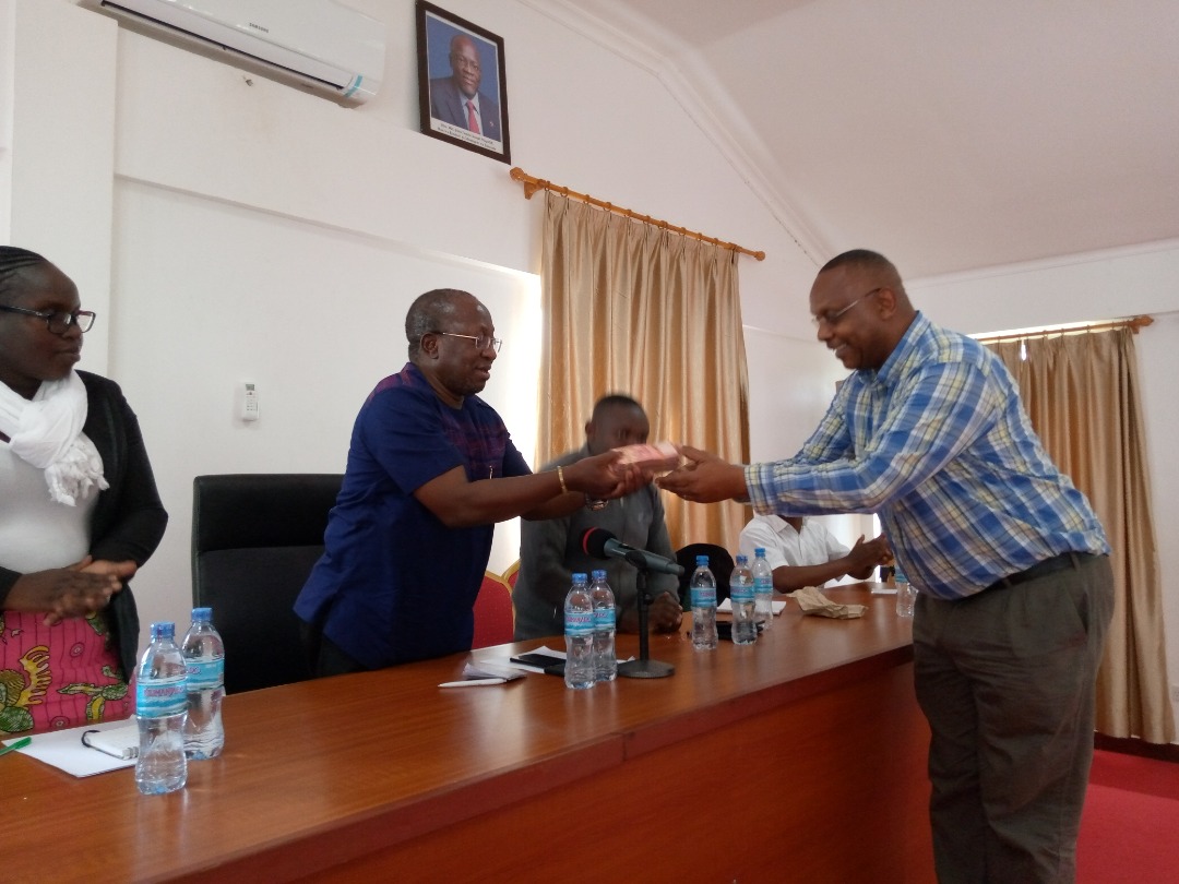Makamu wa Rais wa chama cha riadha taifa William Kalaghe akimkabidhi fedha taslim kiasi cha milioni tatu Waziri Mwakyembe zikiwa ni kwa ajili ya maandalizi ya ushiriki wa wanariadha Failuna Abdi na Alphonse Simbu kwa ajili ya kambi yao picha na Ahmed Mahmoud Arusha.
