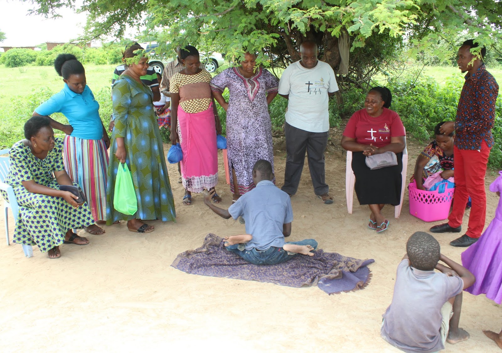Mtoto mwenye ulemavu George Thomasi akishukuru msaada ambao amepatiwa na watumishi hao wa Mungu.