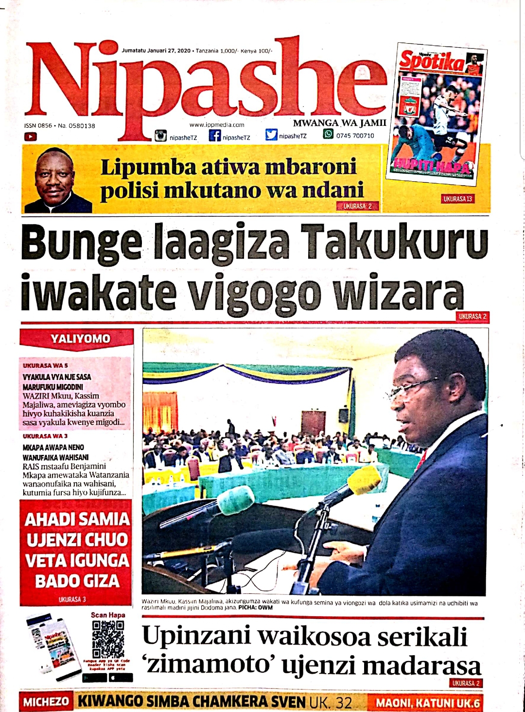 MagazetiPITIA VICHWA VYA HABARI KATIKA MAGAZETI YA LEO JANUARI 27,2020 Last updated: 2020/01/27 at 3:40 AM Alex Sonna 6 years ago Share SHARE Alex Sonna January 27, 2020 January 27, 2020 Share this Article Facebook Twitter Email Print Previous Article TanTrade Yatoa Semina Kwa Wabunge wa Kamati ya Bunge ya Viwanda,Biashara na Mazingira Next Article KOBE BRYANT NA WENGINE TISA AKIWEMO BINTI YAKE WA MIAKA 13 WAFARIKI KATIKA AJALI YA HELIKOPTA