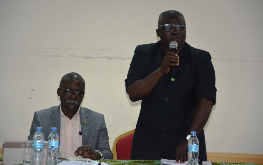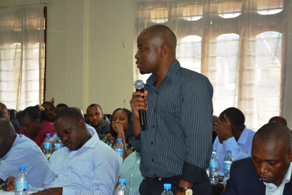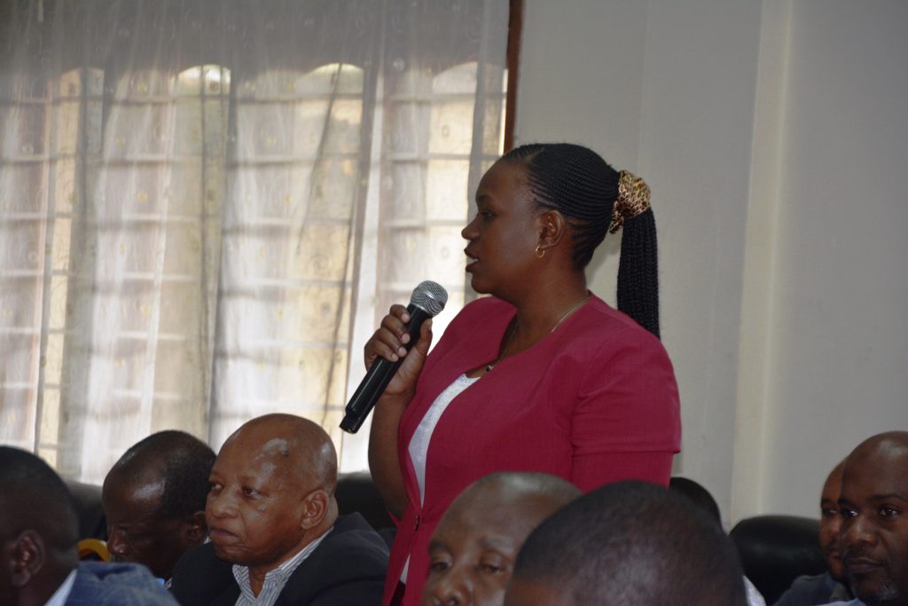 Kaimu Meneja wa Wakala wa Majengo (TBA), mkoa wa Rukwa, Arch. David Luoga na Kaimu Meneja wa TBA mkoa wa Singida, Mhandisi Rebecca Kimambo, wakitoa maoni yao kwa Katibu Mkuu wa Wizara ya Ujenzi, Uchukuzi na Mawasiliano (Sekta ya Ujenzi), Arch. Elius Mwakalinga, katika kikao kilichowakutanisha mameneja hao kujadili tathmini ya utendaji kazi wa Wakala huo, jijini Dodoma.