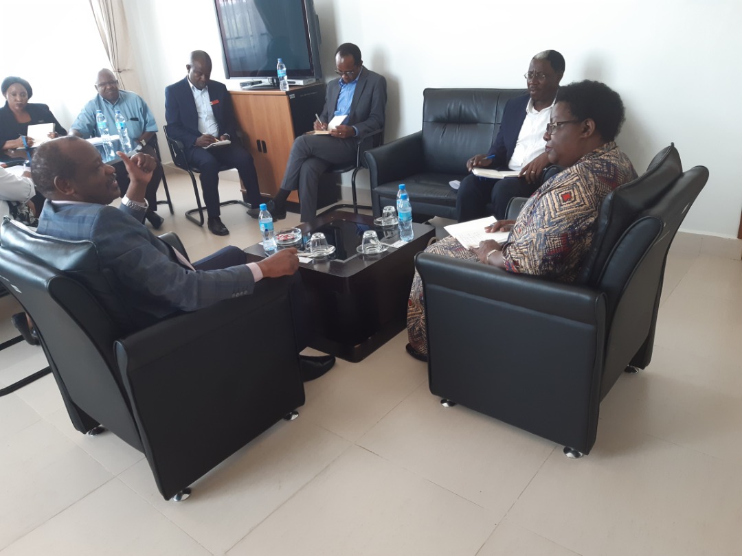 Katibu Mkuu Wizara ya Katiba na Sheria Prof. Sifuni Mchome (kushoto) akiongea na Mwakilishi Mkazi wa Umoja wa Mataifa Bi. Christine Musisi (kulia) alipomtembelea ofisini kwake, Mji wa Serikali Mtumba, Jijini Dodoma kwa ajili ya kujitambulisha. Wengine pichani ni Wakurugenzi kutoka Wizarani hapo.