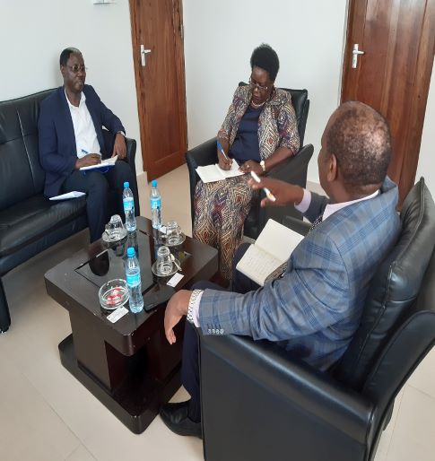 Katibu Mkuu Wizara ya Katiba na Sheria Prof. Sifuni Mchome (kushoto) akiongea na Mwakilishi Mkazi wa Umoja wa Mataifa Bi. Christine Musisi (kulia) alipomtembelea ofisini kwake, Mji wa Serikali Mtumba, Jijini Dodoma kwa ajili ya kujitambulisha. Wengine pichani ni Wakurugenzi kutoka Wizarani hapo.