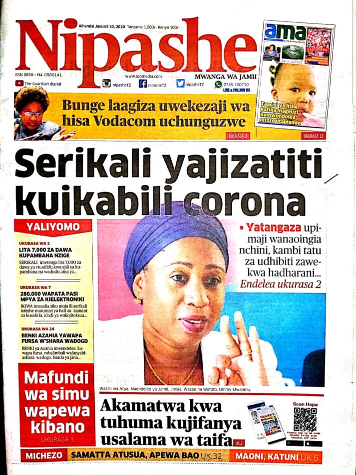 MagazetiPITIA VICHWA VYA HABARI KATIKA MAGAZETI YA LEO JANUARI 30,2020 Last updated: 2020/01/30 at 3:31 AM Alex Sonna 6 years ago Share SHARE Alex Sonna January 30, 2020 January 30, 2020 Share this Article Facebook Twitter Email Print Previous Article RAIS MHE. DKT. MAGUFULI AMJULIA HALI WAZIRI MKUU MSTAAFU MHE. DKT. SALIM AHMED SALIM JIJINI DAR ES SALAAM. JANUARI 29, 2020. Next Article KAGERE AIBEBA SIMBA DAKIKA ZA JIONI YAICHAPA 3-2 NAMUNGO FC