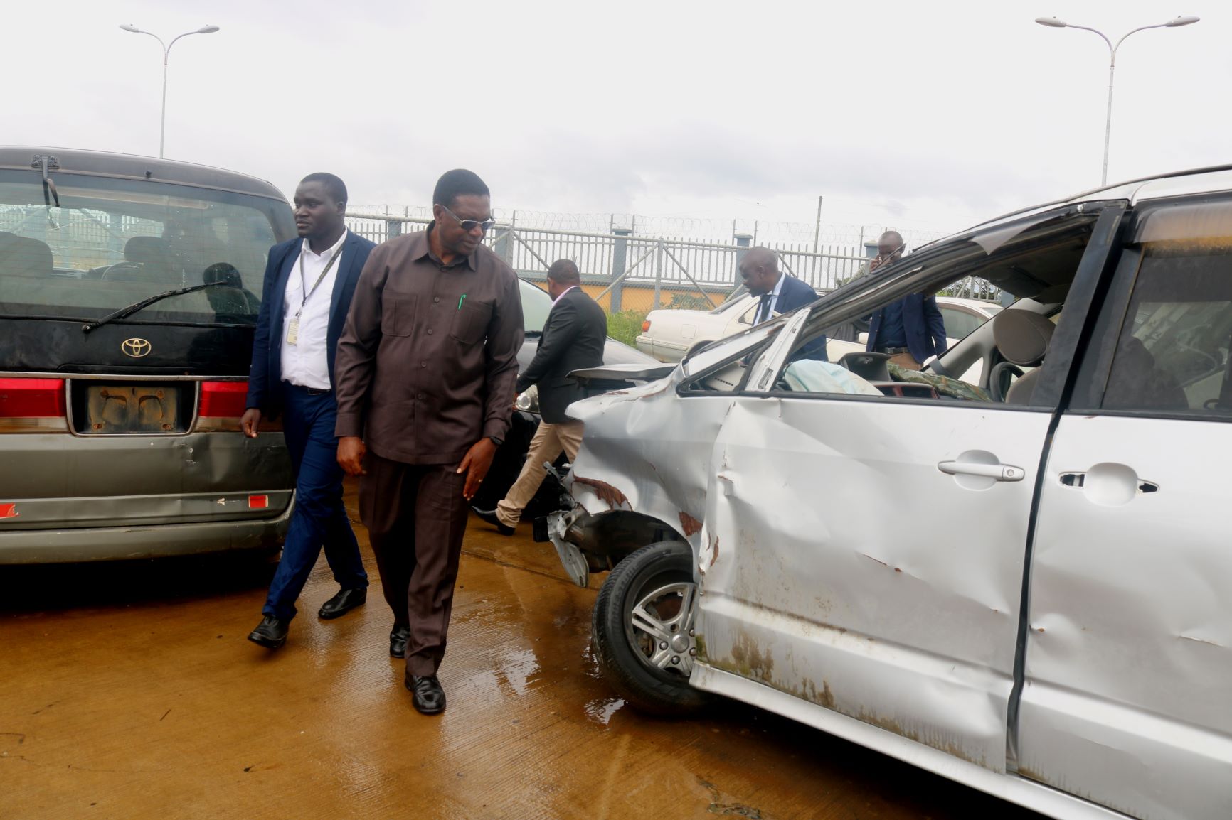 Mkuu wa Mkoa wa Songwe Brig. Jen. Nicodemus Mwangela akikagua baadhi ya magari ambayo yamekamatwa na Mamlaka ya Mapato Tunduma kutokana na kesi mbalimbali ikiwa ni pamoja na magendo.