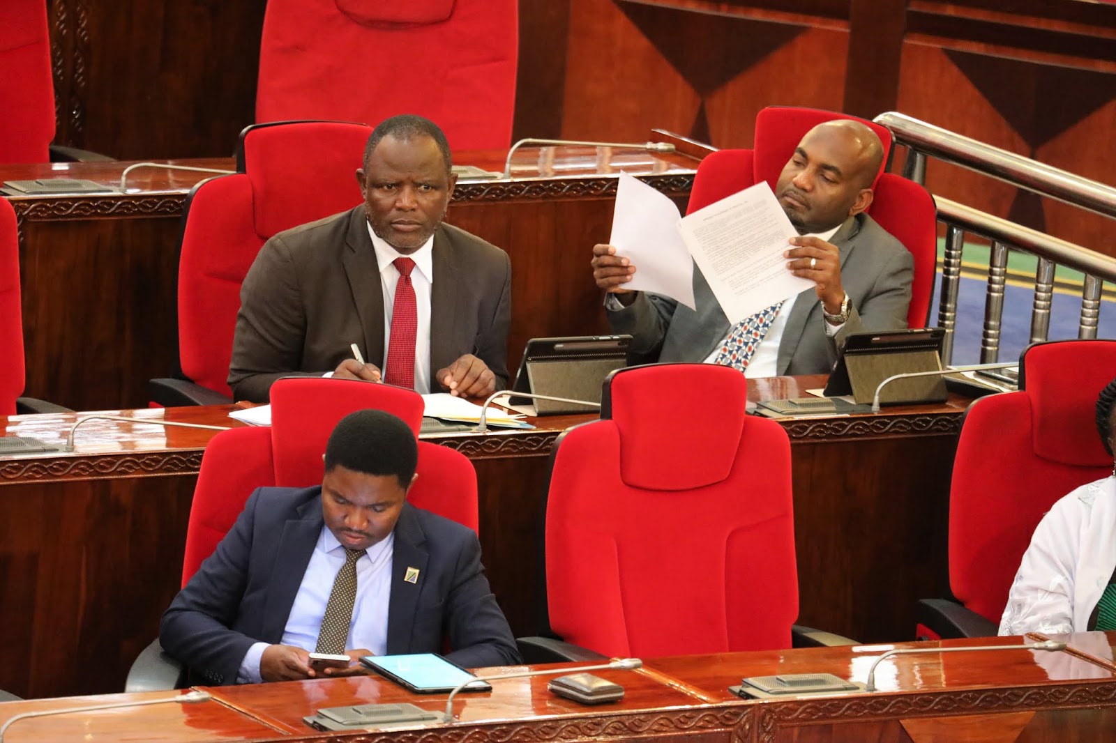 Sehemu ya mawaziri akiwemo Waziri wa Kilimo Mhe Japhet Hasunga (Mb), Waziri wa TAMISEM Mhe Suleima Jaffo na Naibu Waziri wa Mambo ya ndani ya nchi Mhandisi Hamad Masauni wakifatilia kipindi cha maswali na majibu akijibu maswali ya wabunge wakati wa BUnge la kumi na nane Jijini Dodoma tarehe 6 Februari 2020.