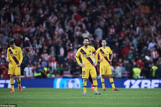 Wachezaji wa Barcelona wakiwa hawaamini macho yao baada ya kuchapwa 1-0 na Athletic Bilbao bao pekee la mshambuliaji Mspaniola, Inaki Williams mwenye asili ya Ghana dakika ya 90 , sekunde chache baada ya Lionel Messi kukosa bao la wazi kwenye mchezo wa Robo Fainali Kombe la Mfalme usiku wa jana Uwanja wa San Mamés Barria mjini Bilbao, hivyo kutolewa kwenye michuano hiyo PICHA ZAIDI SOMA HAPA