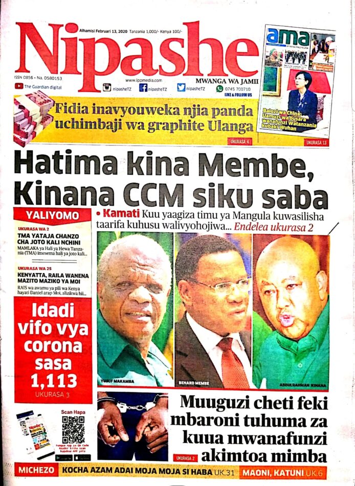 MagazetiUncategorizedPITIA VICHWA VYA HABARI KATIKA MAGAZETI YA LEO FEBRUARI 13,2020 Last updated: 2020/02/13 at 4:12 AM Alex Sonna 6 years ago Share SHARE Alex Sonna February 13, 2020 February 13, 2020 Share this Article Facebook Twitter Email Print Previous Article TWIGA STARS YAENDA TUNISIA KUSHIRIKI MICHUANO MAALUM YA WANAWAKE, UNAF ILIYOANDALIWA NA WENYEJI Next Article SERIKALI YA JAMHURI YA MUUNGANO WA TANZANIA NA SERIKALI YA MAPINDUZI ZANZIBAR ZAAHIDI KUNDELEZA USHIRIKIANO KWENYE SEKTA YA UJENZI