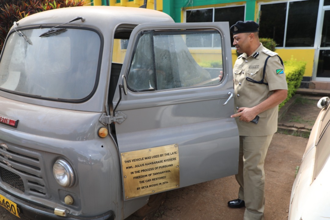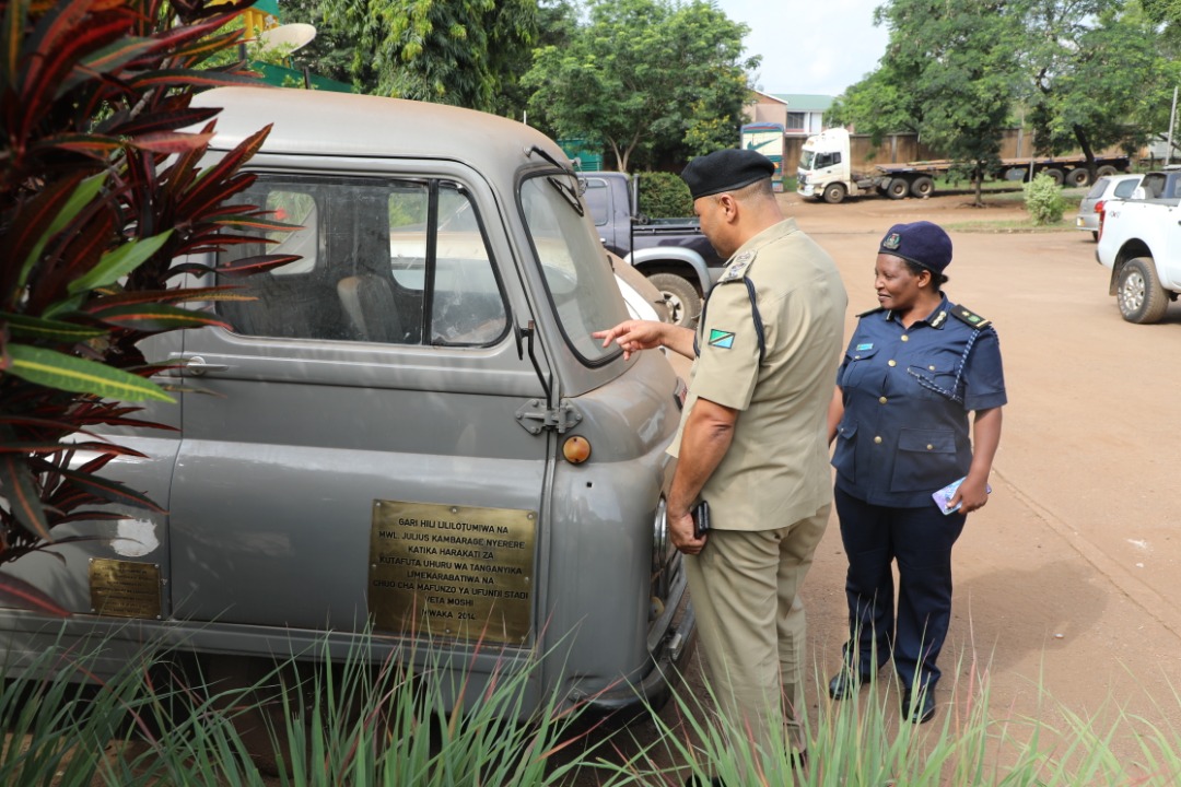 Kamanda wa Polisi Mkoa wa Kilimanjaro, Kamishna Msaidizi wa Polisi Salum Hamduni, akisoma taarifa fupi iliyobandikwa ndani ya gari lililotumiwa na Baba wa Taifa, Hayati Julius Kambarage Nyerere wakati wa harakati za kutafuta Uhuru wa Tanganyika,kulia ni Mkuu wa Uhamiaji, Mkoa wa Kilimanjaro,Kamishna Msaidizi Mwandamizi Tunu Ng’ondya, gari hilo limepaki Makao Makuu ya Chama cha Mapinduzi, mkoani Kilimanjaro.Picha na Wizara ya Mambo ya Ndani ya Nchi