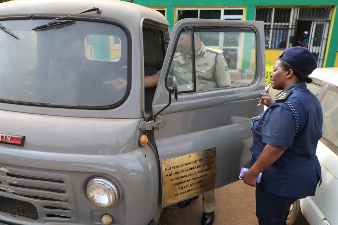 Kamanda wa Polisi Mkoa wa Kilimanjaro, Kamishna Msaidizi wa Polisi Salum Hamduni, akimuonyesha Mkuu wa Uhamiaji, Mkoa wa Kilimanjaro,Kamishna Msaidizi Mwandamizi Tunu Ng’ondya mandhari ya ndani ya gari lililotumiwa na Baba wa Taifa, Hayati Julius Kambarage Nyerere wakati wa harakati za kutafuta Uhuru wa Tanganyika, gari hilo limepaki Makao Makuu ya Chama cha Mapinduzi, mkoani Kilimanjaro.Picha na Wizara ya Mambo ya Ndani ya Nchi