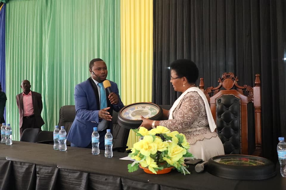 Kiongozi Mkuu wa Huduma ya Sauti ya Uponyaji Tanzania, Nabii Joshua Aram Mwantyala akimkabidhi kwa niaba ya Spika Ndugai, mkewe Dkt.Fatma Mganga ambaye alimwakilisha Spika katika uzinduzi wa Programu ya Kuliombea Taifa zawadi ya saa zenye picha na ujumbe maalum wa Mungu kwa ajili ya Rais wa Jamhuri ya Muungano wa Tanzania, Dkt.John Magufuli na Spika wa Jamhuri ya Muungano wa Tanzania, Job Ndugai, baada ya uzinduzi uliofanyika katika Chuo cha Mipango ukumbi wa Mwalimu Nyerere. (Na Mpiga Picha Wetu).