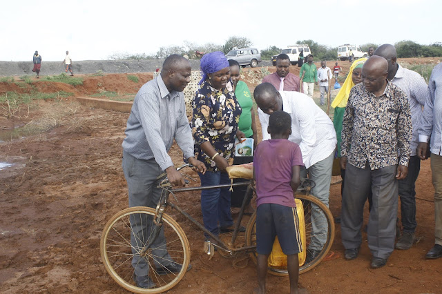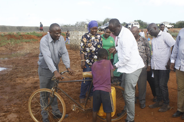 NAIBU Waziri wa Maji Jumaa Aweso kulia akimsaidia kufunga madumu ya maji kwenye baiskeli mtoto aliyemkuta akichota maji kwenye bwawa wakati wa ziara yake wilayani humo kushoto ni Mkuu wa wilaya ya Mkinga Mark Yona