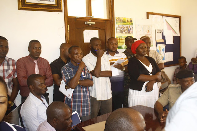 Sehemu ya watumishi wa Halmashauri ya Mkinga wakimsikiliza Naibu Waziri wa Maji Jumaa Aweso