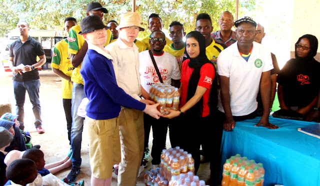 Watoto wenye ualbino wakiwa na juice kutoka kampuni ya vinywaji ya Jambo.