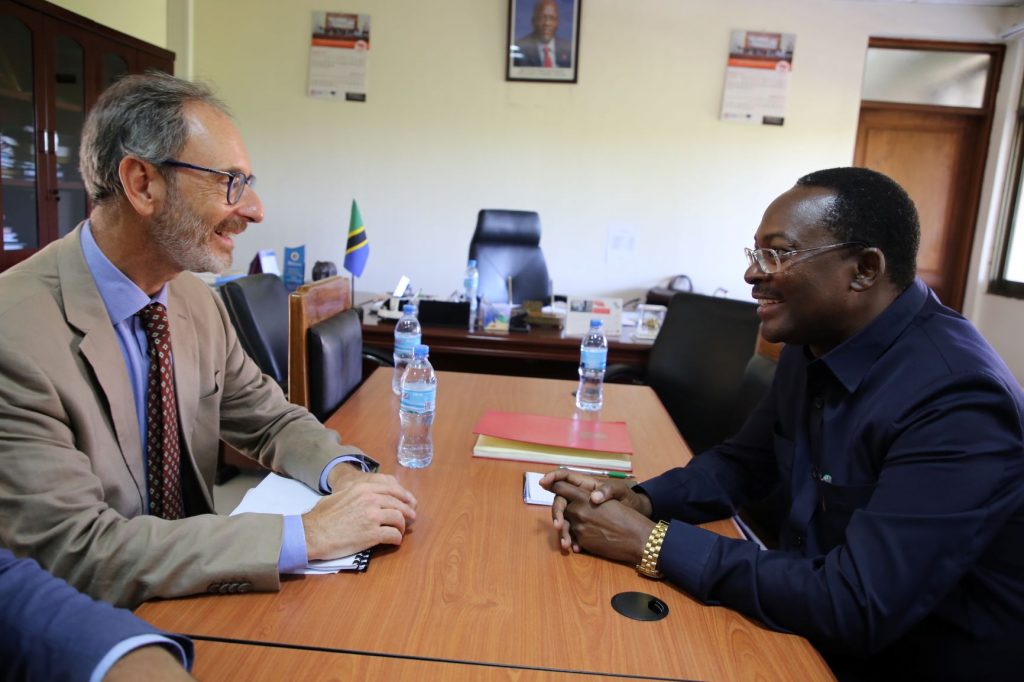 Waziri wa Mambo ya Ndani ya Nchi, George Simbachawene (kulia) akizungumza na Balozi wa Umoja wa Ulaya, Manfredo Fanti, masuala mbalimbali ya ushirikiano kati ya Umoja huo na Tanzania. Mazungumzo hayo yalifanyika katika ofisi ndogo ya Waziri huyo, jijini Dar es Salaam leo.