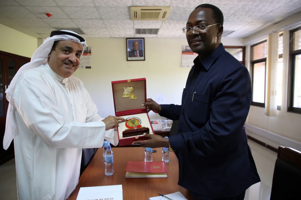 Waziri wa Mambo ya Ndani ya Nchi, George Simbachawene (kulia) akipokea zawadi kutoka kwa Balozi wa Kuwait Nchini, Mubarak Alsehaijan, baada ya kumaliza kikao chao kilichofanyika jijini Dar es Salaam, leo.