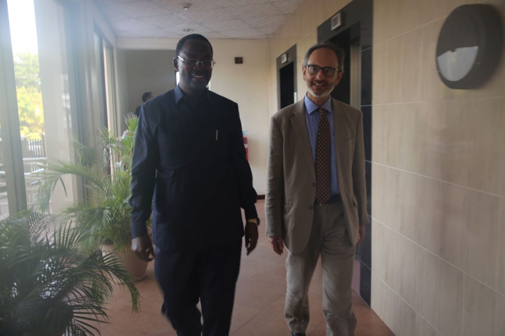 Waziri wa Mambo ya Ndani ya Nchi, George Simbachawene (kushoto), akimsindikiza Balozi wa Umoja wa Ulaya, Manfredo Fanti, baada ya mzungumzo yao ya kujadili masuala mbalimbali ya ushirikiano kati ya Nchi yake na Tanzania. Mazungumzo hayo yalifanyika katika ofisi ndogo ya Waziri huyo, jijini Dar es Salaam leo.
