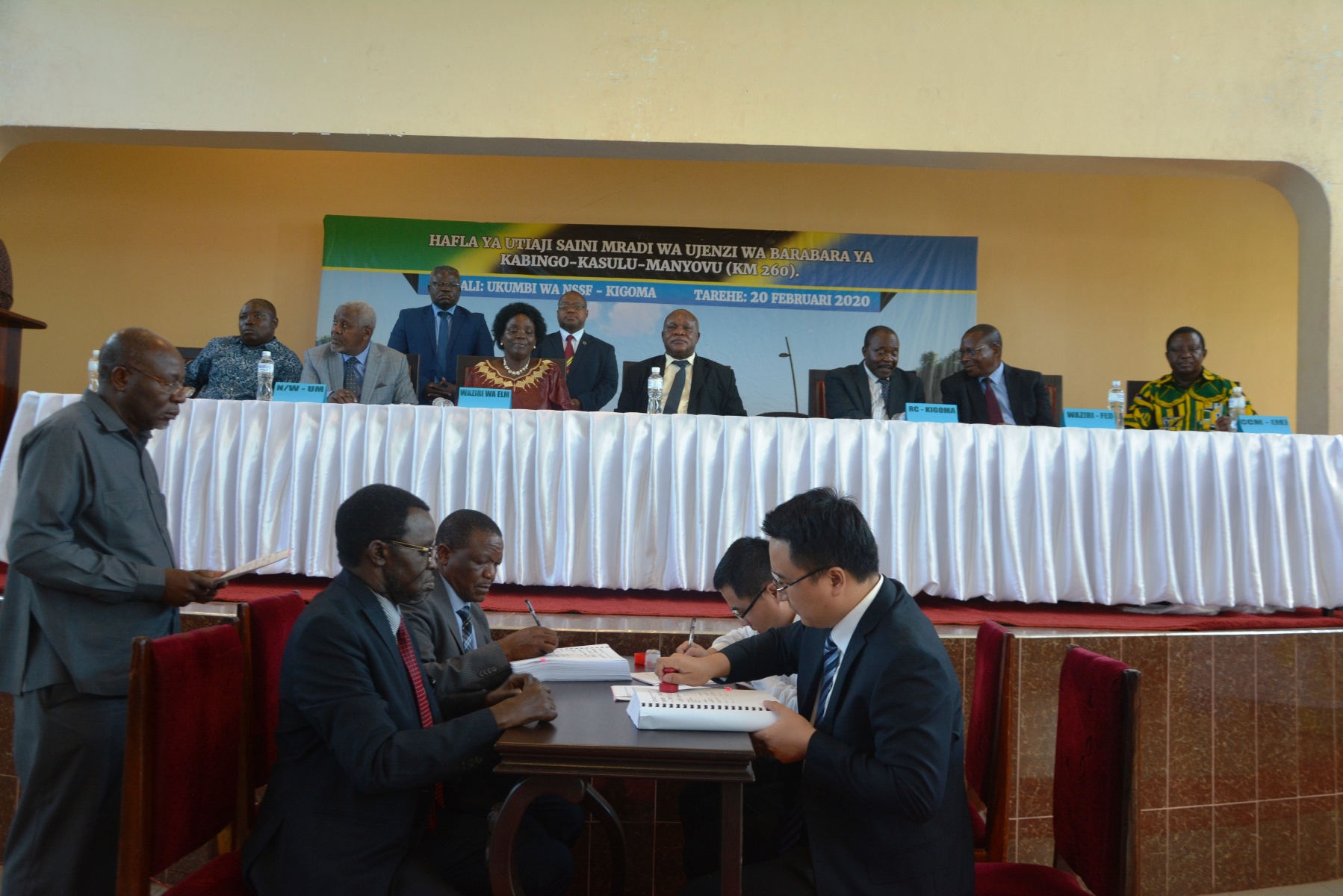 Wakurugenzi kutoka Wizara ya Ujenzi, Uchukuzi na Mawasiliano (Sekta ya Ujenzi) pamoja na Wabunge wa Mkoa wa Kigoma wakisikiliza hotoba ya Waziri wa Ujenzi, Uchukuzi na Mawasiliano, Mhandisi Isack Kamwelwe (hayupo pichani), katika hafla ya utiaji saini mikataba minne ya mradi wa ujenzi kwa kiwango cha lami wa barabara ya Kabingo – Kasulu -Manyovu (Km 260), mkoani Kigoma.