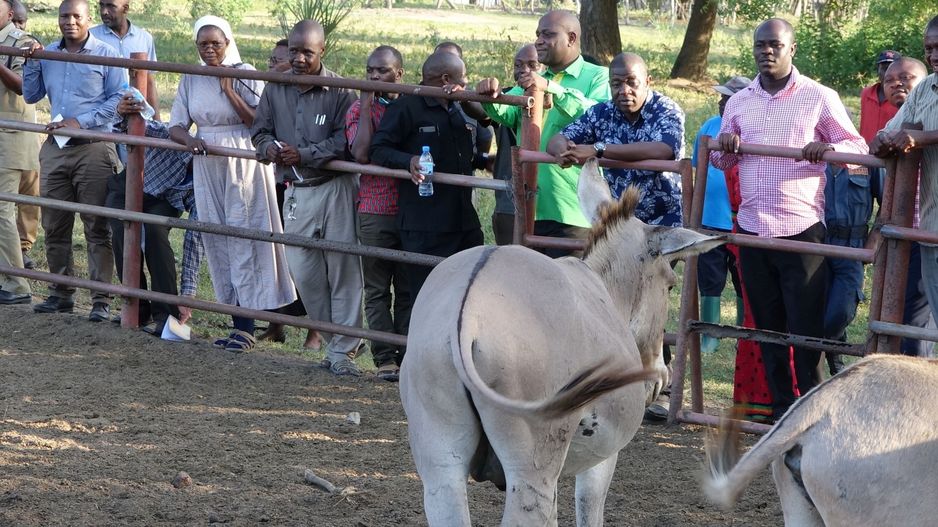 Mbunge wa Jimbo la Pangani Mhe. Jumaa Aweso ( wa kwanza kutoka kulia) akifuatiwa na Naibu Waziri wa Mifugo na Uvuvi Mhe. Abdallah Ulega wakikagua punda waliyopo katika Shamba la Serikali Mivumoni Wilaya ya Pangani Mk.