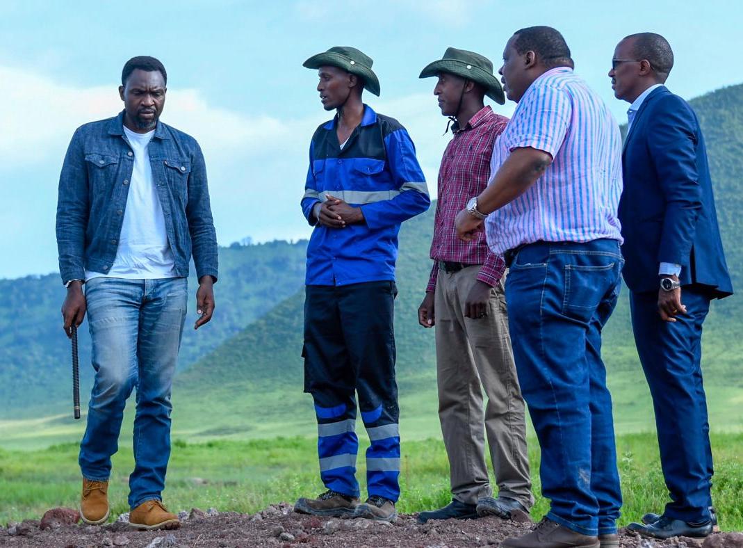 Waziri wa Maliasili na Utalii Dkt. Hamisi Kigwangalla (kushoto) akiwa na Kamishna wa Uhifadhi Mamlaka wa Hifadhi ya Ngorongoro (NCAA) Dkt. Freddy Manongi (wa pili kutoka kulia) na wahandishi wa NCAA wakati wa ziara ya kukagua kazi ya ukarabari wa barabara za kreta ya Ngorongoro.
