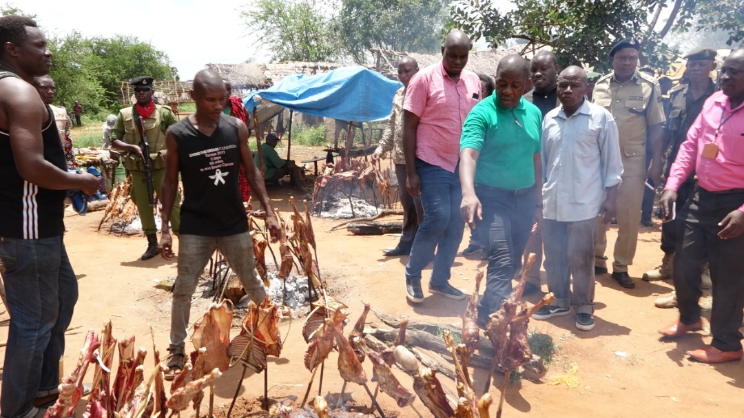 Naibu Waziri wa Mifugo na Uvuvi Mhe. Abdallah Ulega akikagua eneo linalotumika kuchoma nyama kwenye mnada wa Ndelema uliopo katika Halmashauri ya Mji wa Handeni Mkoani Tanga wakati akihitimisha ziara yake wilayani .