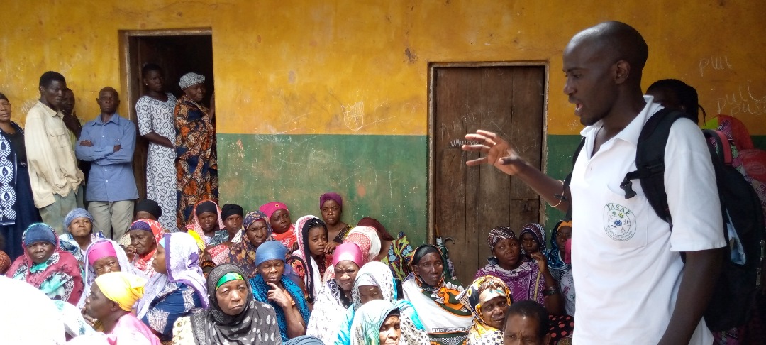 Afisa Mwezeshaji wa mfuko wa Maendeleo ya jamii Nchini(TASAF)wilaya ya Tunduru Mkoani Ruvuma Avelinius Rwegasira akiongea jana na wanufaika wa mpango wa kunusuru kaya maskini katika kijiji cha Tanesco Tunduru mjini wakati wa malipo kwa walengwa hao.