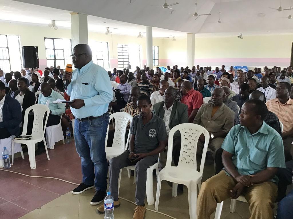 Meneja Masoko wa Busega Mazao Company Ltd, Bw. Innocent Mafuru akichangia hoja katika Mkutano wa mashauriano kati ya Serikali, Wawekezaji na Wafanyabiashara mkoani Simiyu uliofanyika Februari 25, 2020 Mjini Bariadi.