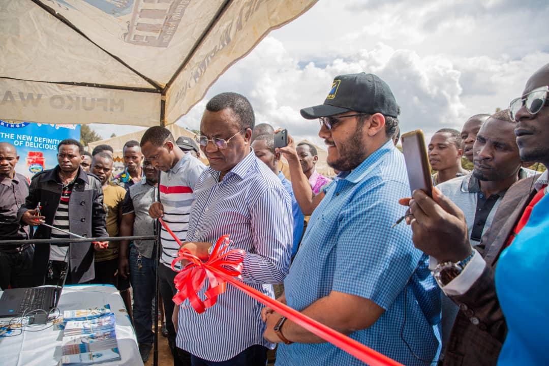Waziri wa Ardhi, Nyumba na Maendeleo ya Makazi, William Lukuvi akikata utepe kuzindua uandikishwaji wa madereva bajaji kuweza kukata bima ya afya ambapo wamedhaminiwa na kampuni ya maziwa ya Asas ambapo mkurugenzi wake Ahmed Salim Abri akiwa pembeni mwa kushoto kwal Lukuvi.