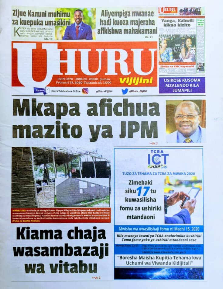 MagazetiPITIA VICHWA VYA HABARI KATIKA MAGAZETI YA LEO FEBRUARI 28,2020 Last updated: 2020/02/28 at 4:21 AM Alex Sonna 6 years ago Share SHARE Alex Sonna February 28, 2020 February 28, 2020 Share this Article Facebook Twitter Email Print Previous Article MBUNGE MAVUNDE AKABIDHI VISHKWAMBI 700 KWA SHULE 10 ZA MSINGI ZA SERIKALI NA BINAFSI JIJINI DODOMA Next Article KATIBU MKUU WIZARA YA VIWANDA NA BIASHARA APOKEA UJUMBE KUTOKA SEKRETARIETI YA SOKO LA PAMOJA LA MASHARIKI NA KUSINI MWA AFRIKA COMESA