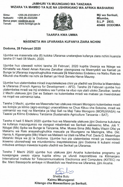 Ujumbe huo utawasili nchini tarehe 29 Februari, 2020 kupitia Uwanja wa Ndege wa Kimataifa wa Abeid Aman Karume Zanzibar utaongozwa na Mwenyekiti wa Kamati ya Bunge la Ufaransa