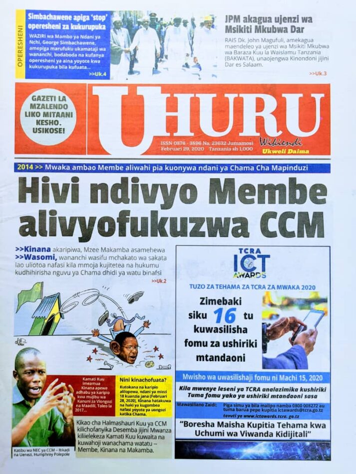 MagazetiPITIA VICHWA VYA HABARI KATIKA MAGAZETI YA LEO FEBRUARI 29,2020 Last updated: 2020/02/29 at 3:56 AM Alex Sonna 6 years ago Share SHARE \ Alex Sonna February 29, 2020 February 29, 2020 Share this Article Facebook Twitter Email Print Previous Article MAJUKWAA YA HAKI JINAI YA MIKOA YOTE YAZINDULIWA KITAIFA SINGIDA Next Article TANESCO Kuimarisha Hali ya Upatikanaji wa Umeme Mkoani Kagera