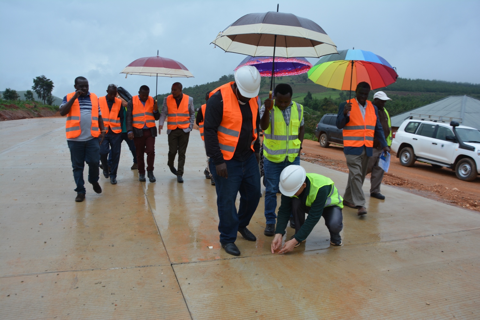 Mhandisi Mshauri, Moon Dong Ryeol, anayesimamia barabara ya Itoni- Ludewa- Manda sehemu ya Lusitu- Mawengi (Km 50) inayojengwa kwa kiwango cha zege akimuonesha Katibu Mkuu wa Wizara ya Ujenzi, Uchukuzi na Mawasiliano, anayeshughulikia Sekta ya Ujenzi, Mbunifu Majengo, Elius Mwakalinga (Wa Kwanza Kushoto mbele), maungio ya zege yaliyopo katika barabara hiyo, mkoani Njombe.