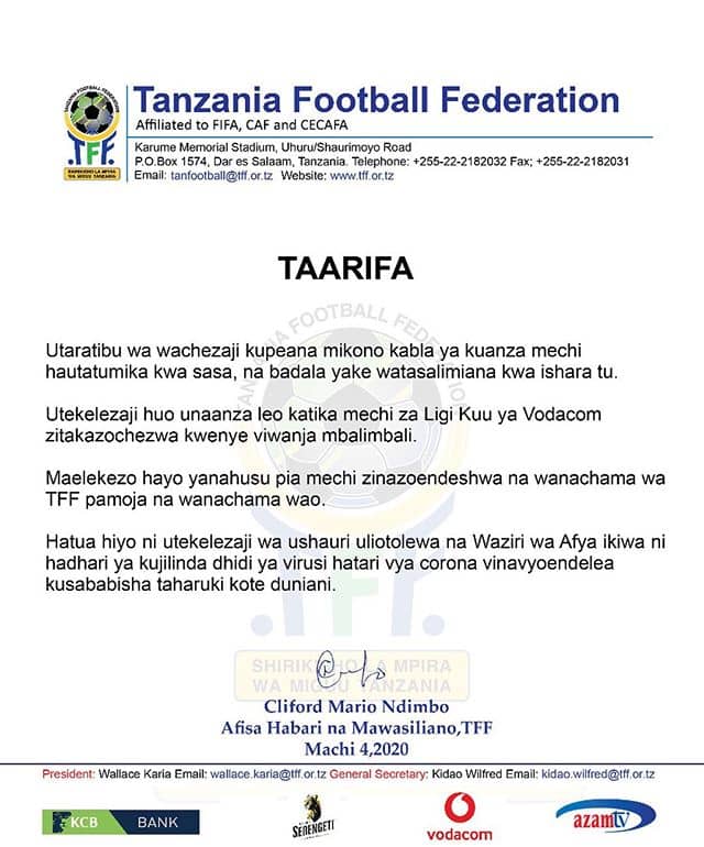MichezoTFF YASEMA NENO KUHUSU UGONJWA WA CORONA Last updated: 2020/03/04 at 11:10 AM joseph 6 years ago Share SHARE joseph March 4, 2020 March 4, 2020 Share this Article Facebook Twitter Email Print Previous Article WAZIRI UMMY ATOA MASAA KWA HALMASHAURI ZOTE KUTENGA SEHEMU ZA KUWEKA WASHUKIWA WA CORONA Next Article Serikali zawahakikishia Amani Wakimbizi