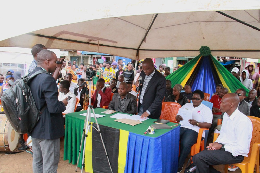 Kaimu Katibu Tawala Wilaya ya Maswa Venance Salia akizungumza na wananchi wa Wilaya ya Bariadi wakati walipokuwa wakiupokea msafara wa kijinsia ulipofika Wilayani humo.