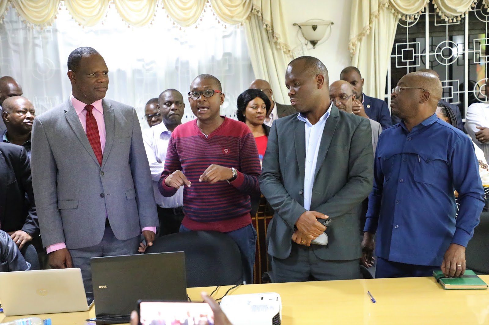 Afisa Mawasiliano serikalini Wizara ya Kilimo Ndg Issa Sabuni (Mwenye Fulana) jambo mbele ya Waziri wa Kilimo Mhe Japhet Hasunga (Mwenye Tai) wakati wa uzinduzi wa mtandao wa kutoa habari (Kilimo Tv) uliofanyika katika ukumbi wa mikutano maarufu Kilimo IV Jijini Dodoma tarehe 8 Machi 2020. Wengine pichani ni Katibu Mkuu Wizara ya Kilimo Ndg Gerald Kusaya (asiye na Tai) na Naibu Katibu Mkuu Wizara ya Kilimo Prof Siza Tumbo (Mwenye kaunda suti). (Picha Zote Na Mathias Canal, Wizara ya Kilimo)