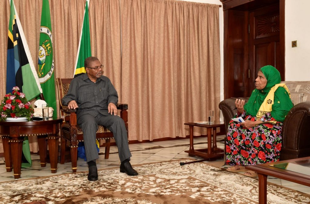RAIS wa Zanzibar na Mwenyekiti wa Baraza la Mapinduzi Mhe.Dk. Ali Mohamed Shein, akimsikiliza Mwenyekiti wa Taasisi ya Mwanaharakati Bibi Siti Bint. Saad, Bi. Nasra Mohammed Hilal, alipofika Ikulu Jijini Zanzibar kwa mazungumzo yaliofanyika katika ukumbi wa Ikulu Jijini Zanzibar na kumkabidhi Kadi ya Uanachama No.1 na Picha ya Siti Bint Saad, hafla hiyo imefanyika leo 10-3-2020, katika ukumbi wa Ikulu