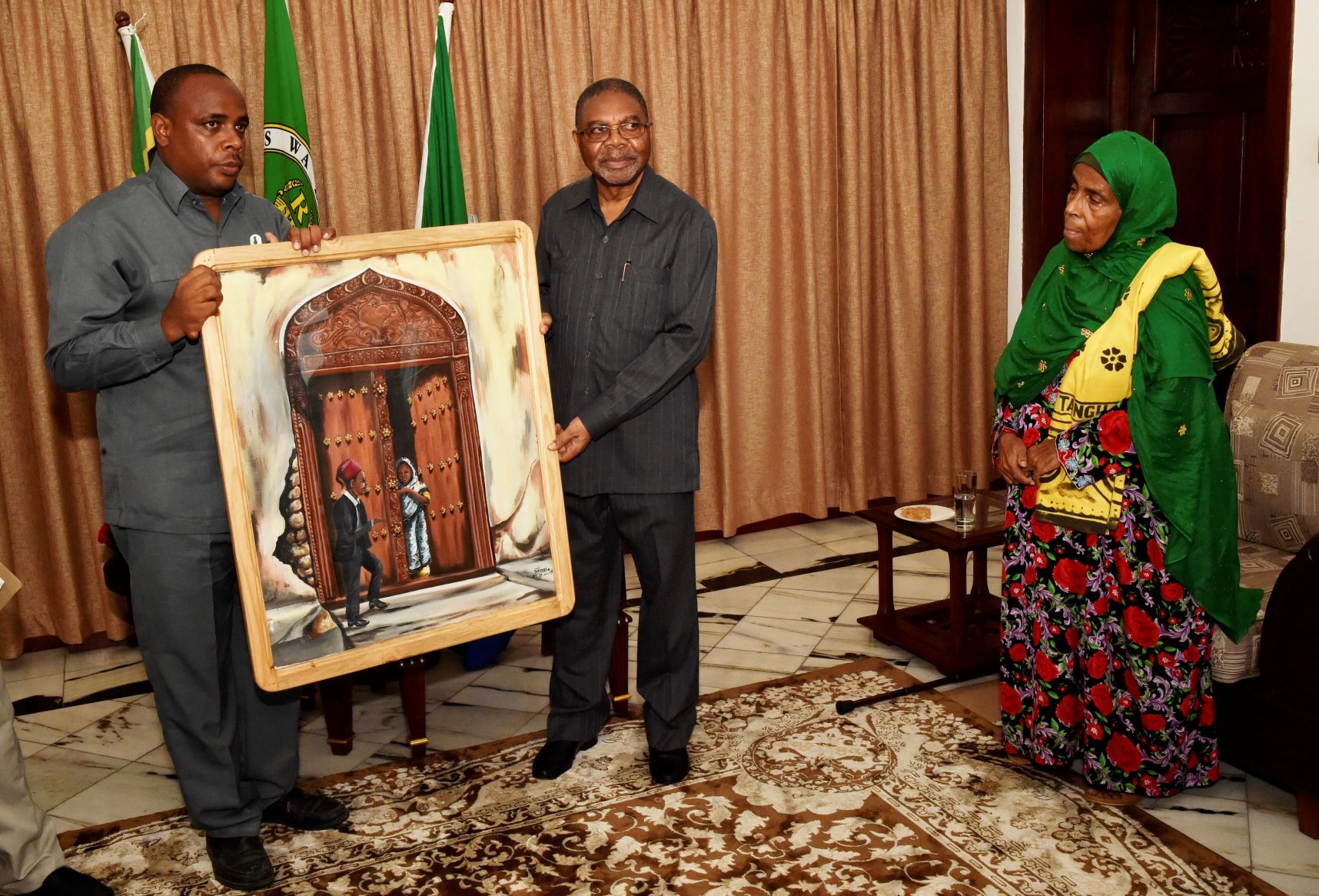 RAIS wa Zanzibar na Mwenyekiti wa Baraza la Mapinduzi Mhe.Dk. Ali Mohamed Shein, akikabidhiwa picha ya Siti Binti Saad, “ikimoonesha Bi. Siti Bint Saad na Bwa. Ali Muhsin, aliyemuibua katika fani ya uimbaji ” akikabidhi Katibu wa Taasisi hiyo Dkt. Mohammed Omar na (kushoto kwa Rais) Mwenyekiti wa Taasisi ya Mwanaharakati Bibi Siti Bint Saad.Bi.Nasra Mohammed Hilal, hafla hiyo imefanyika leo 10-3-2020,Ikulu Jijini Zanzibar.