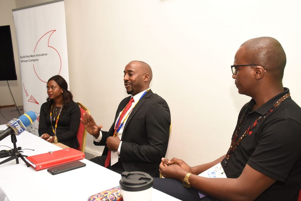 Mkurugenzi wa Huduma za Kidijitali wa Vodacom Tanzania PLC, Nguvu Kamando (kushoto)akizungumza na waandishi wa habari kwenye semina ya maadhimisho ya wiki ya ubunifu leo, Vodacom imetoa fursa kwa wanavyuo waliomaliza masomo na wenye uwezo wa ubunifu ili kuwawezesha kufikia malengo yao ya ubunifu kwa kushirikiana na SmartLab. Kushoto yake ni Mkurugenzi Mkuu wa Smartlab Tanzania, Edwin Bruno