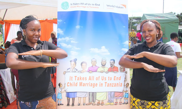 Maafisa kutoka Shirika la World Vision kupitia Mradi wa ENRICH wakionesha alama ya Usawa wa Kijinsia wakati Maadhimisho ya Siku ya Wanawake Duniani Mkoa wa Shinyanga yaliyofanyika katika kata ya Iselamagazi halmashauri ya wilaya ya Shinyanga.