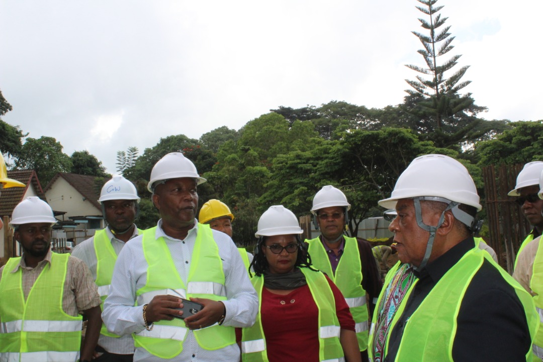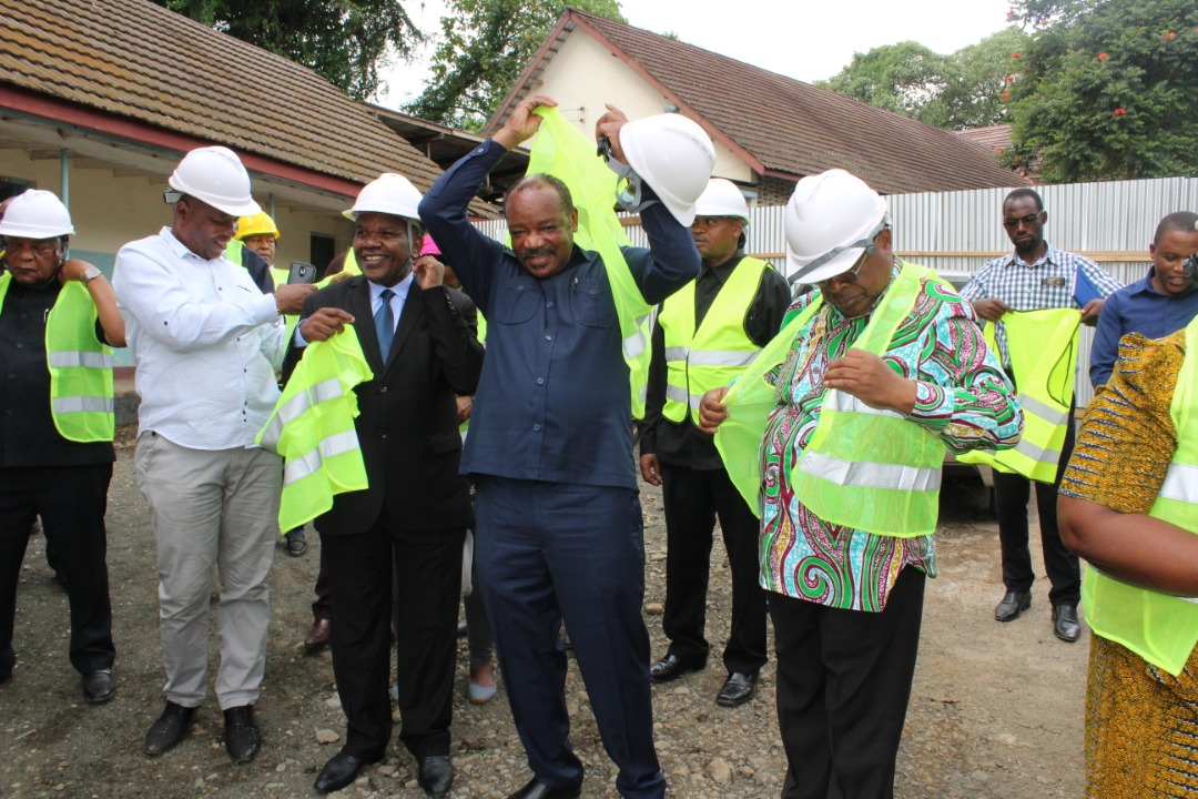 Kamati ya Kudumu ya Bunge ya Katiba na Sheria wakivaa vifaa vya kujilinda muda mfupi kabla ya kuanza ukaguzi wa ujenzi wa jengo la Mahakama Kuu Kanda ya Arusha.