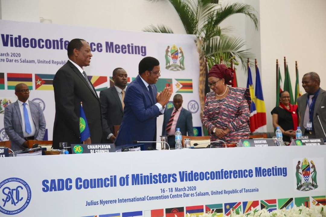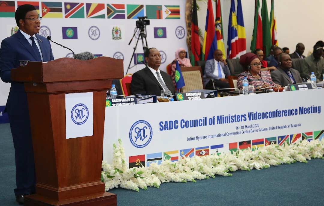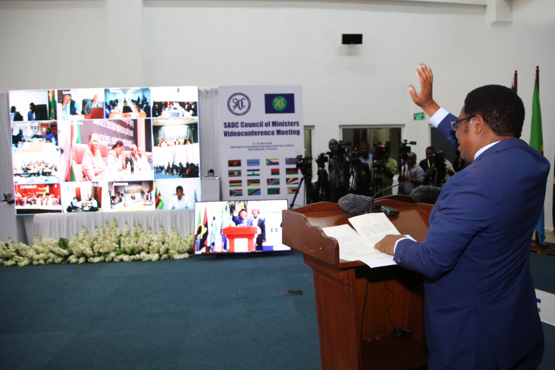 Waziri Mkuu, Kassim Majaliwa akiwasalimia washiriki wa Mkutano wa Baraza la Mawaziri wa Jumuiya ya Maendeleo Kusini Mwa Afrika (SADC) alioufungua kwa njia ya video kwenye Kituo cha Mikutano cha Kimataifa cha Julius Nyerere jijini Dar es salaam, Machi 18, 2020. (Picha na Ofisi ya Waziri Mkuu)