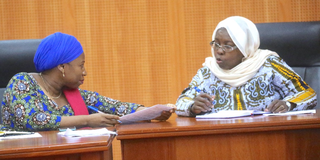 Waziri wa Afya, Maendeleo ya Jamii, Jinsia, Wazee na Watoto, Ummy Mwalimu (kushoto) akiteta na Katibu Mkuu wa Wizara hiyo, Dkt.Zainab Chaula katika Kikao Kazi cha Mawaziri na Makatibu Wakuu cha kujadili ugonjwa wa Corona (COVID-19) kilichoongozwa na Waziri Mkuu, Kassim Majaliwa kwenye ukumbi wa Hazina jijini Dodoma, Machi 23, 2020. (Picha na Ofisi ya Waziri Mkuu)