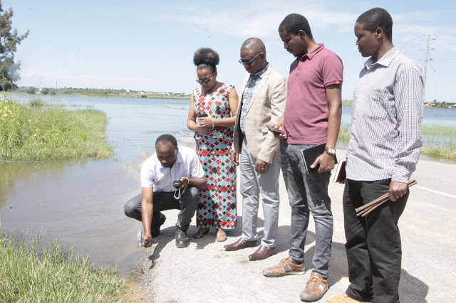 Wananchi wakiangalia hali isiyo ya kawaida ya ujazo wa maji uliosababisha Maziwa ya Kindai na Munang kuungana.