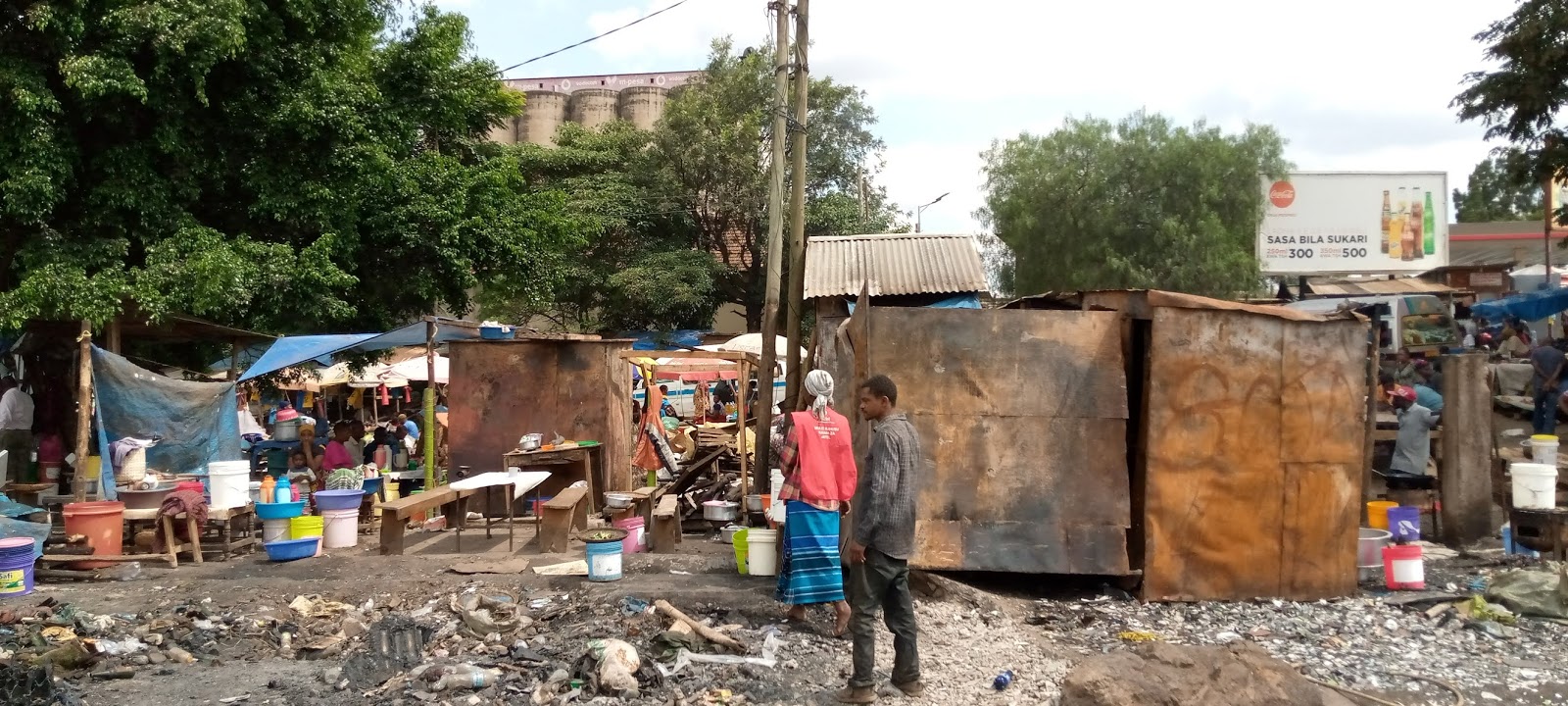 | Sehemu ya vibanda vilivyo pembezo mwa soko hilo wakiendelea na biashara wakati wa ziara ya mkuu wa mkoa wa Arusha Mrisho Gambo |