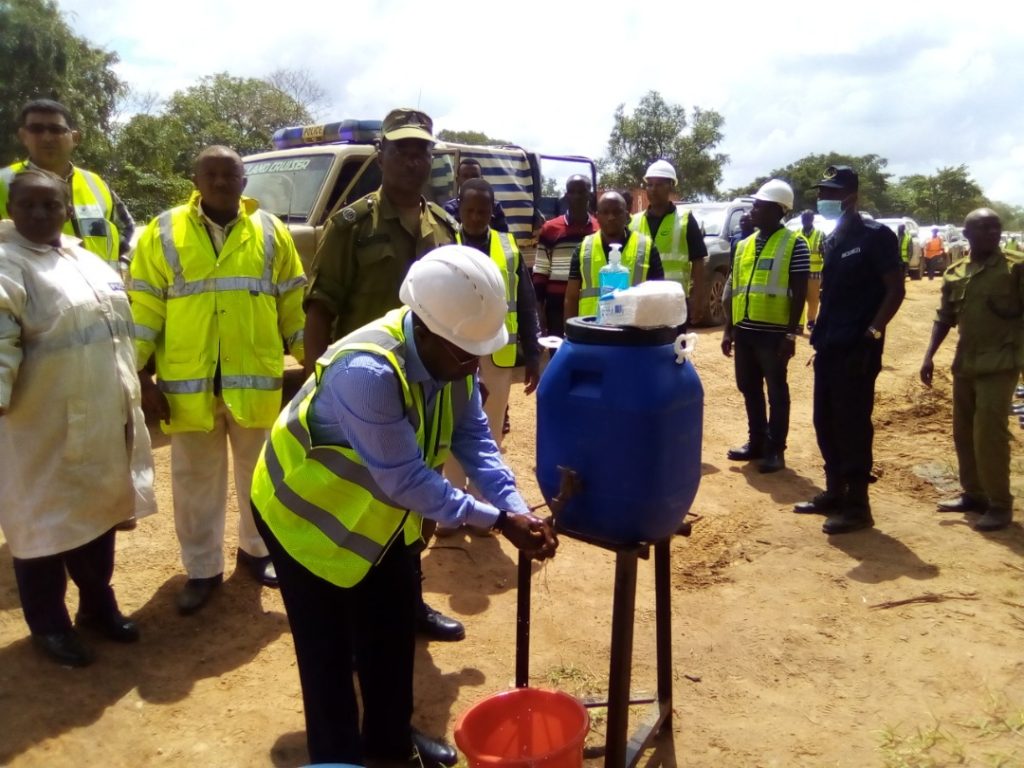 Waziri wa Nishati Dkt Medard Kalemani akitekeleza agizo la Serikali kupitia Wizara ya afya la kunawa mikono kwa sabauni na maji tiririka ili kupaamba na kuenea kwa virus covid 19 vinavyosababisha homa kali ya mapafu,kabla ya kuingia katika mradi wa ujenzi wa bwawa la kufua umeme wa JULIUS NYERERE MW 2115 jana April 5, 2020.