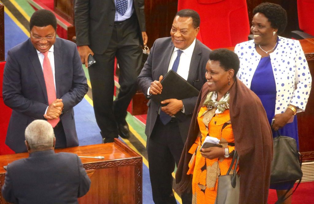 Waziri Mkuu, Kassim Majaliwa akizungumza na Waziri wa Nchi, Ofisi ya Rais, Menejimenti ya Utumishi wa Umma na Utawala Bora, Kapteni Mstaafu, George Mkuchika (kushoto) baada ya Bunge kupitisha Bajeti ya Ofisi ya Waziri Mkuu, Taasisi zake na Mfuko wa Bunge kwa mwaka 2020/2021. Wa tatu kulia ni Waziri wa Katiba na Sheria, Balozi Dkt. Augustine Mahiga, kulia ni Waziri wa Elimu, Sayansi na Tekinolojia , Profesa Joyce Ndalichako, na wa pili kulia ni Naibu Waziri wa Ardhi, Nyumba na Maendeleo ya Makazi, Dkt Angelina Mabula. (Picha na Ofisi ya Waziri Mkuu)