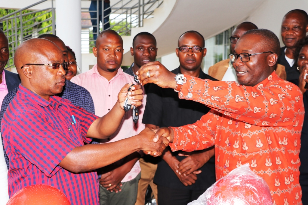 Mkuu wa Mkoa Mwanza, John Mongella (kulia) akikabidhi ufunguo wa pikipiki kwa Mwenyekiti wa Maafisa Tarafa Mkoa Mwanza, Peter Michael (kushoto) kama ishara ya kukabidhi pikipiki 24 kwa Maafisa Tarafa wa Tarafa zote 24 za Mkoa Mwanza.