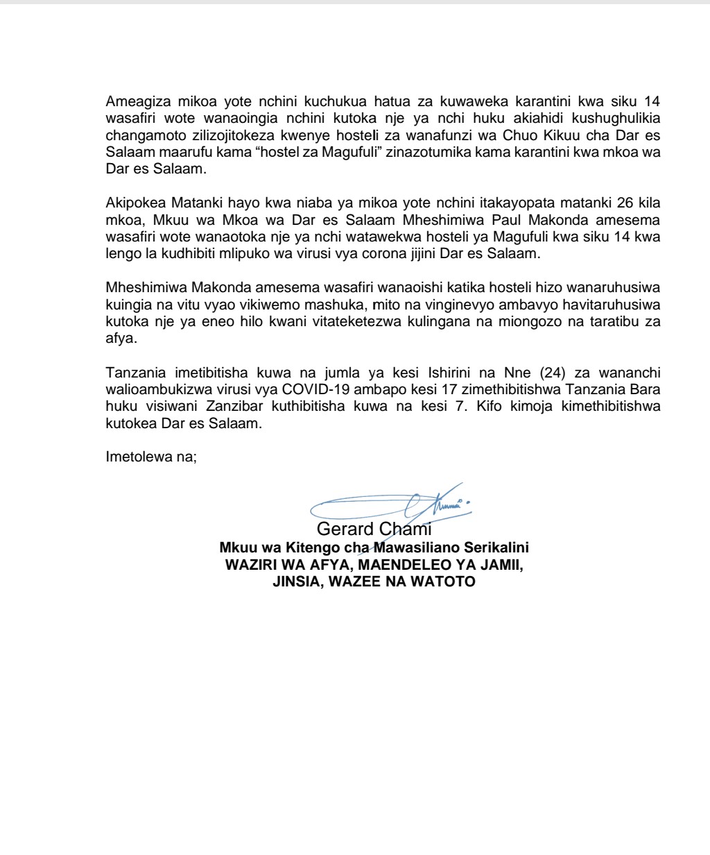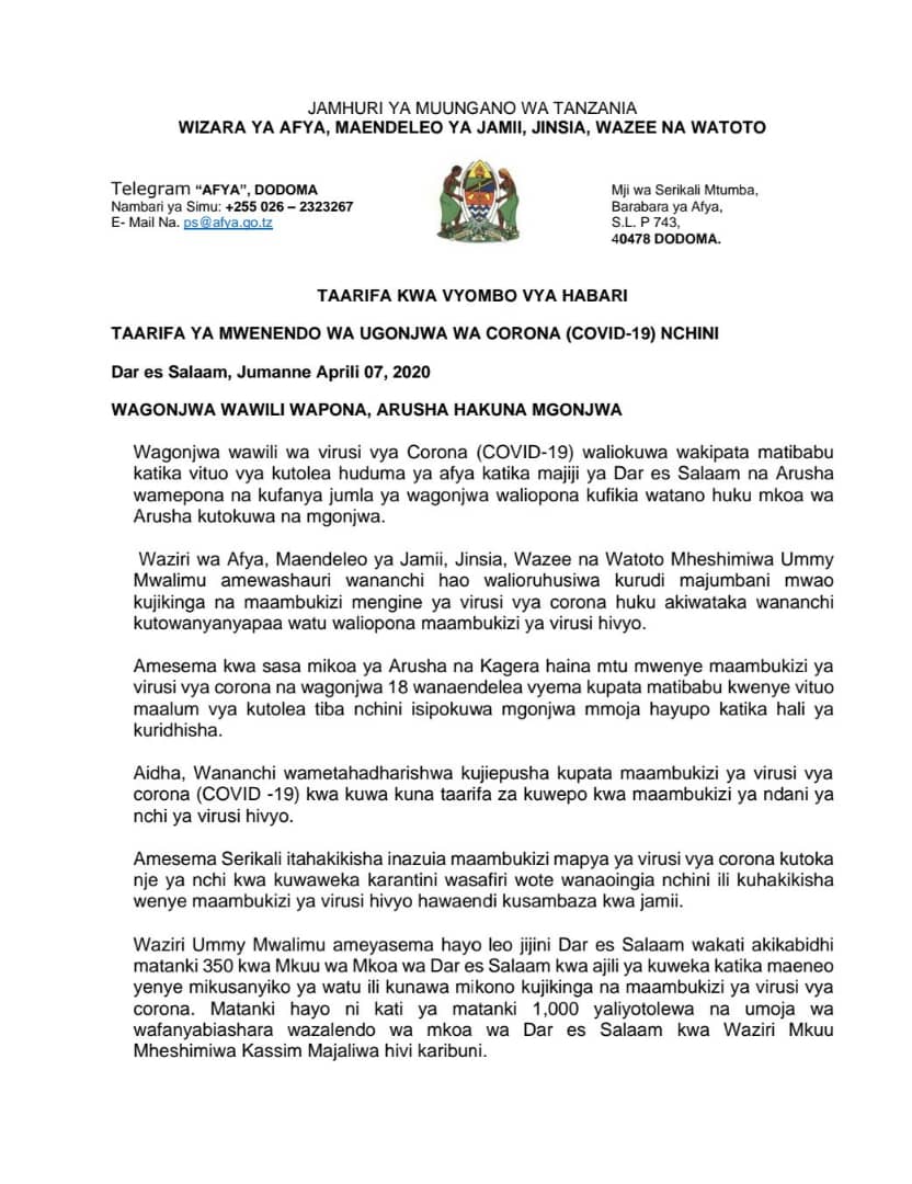 MchanganyikoTAARIFA YA MWENENDO WA UGONJWA WA CORONA (COVID-19) NCHINI Last updated: 2020/04/07 at 2:01 PM joseph 6 years ago Share SHARE joseph April 7, 2020 April 7, 2020 Share this Article Facebook Twitter Email Print Previous Article Naona Kama Ndoto – Asema Mzee Kisangani Next Article Waziri Ummy akabidhi matenki 1000 kwa wananchi ya kunawa mikono